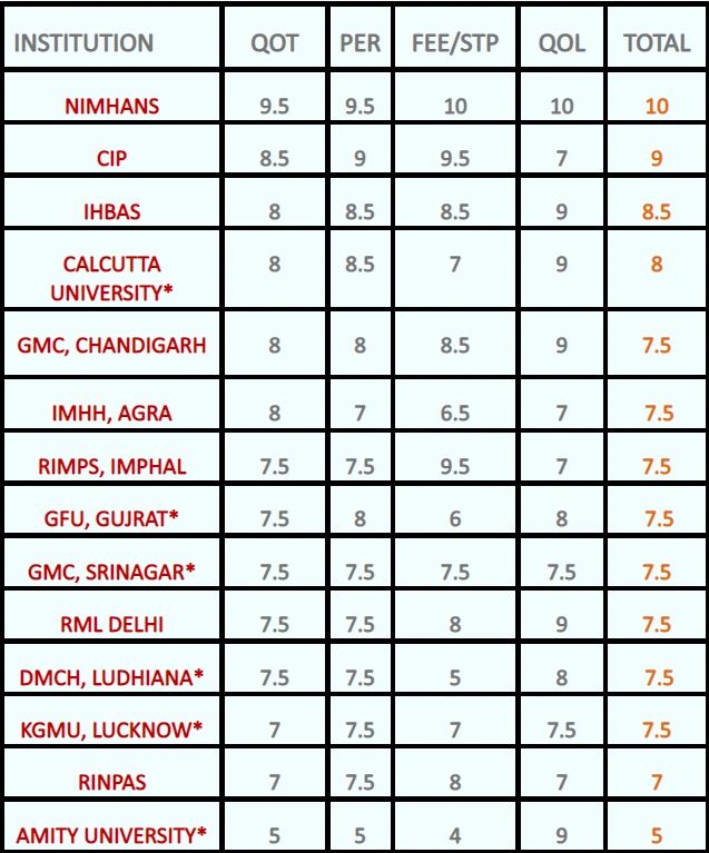 Our team and students who have cleared MPhil Clinical Psychology Exams have rated different institutions based on the quality of training, infrastructure, fees, stipend, perception of the institution and quality of living. This is our opinion and doesn't represent any final verdict regarding any institution.